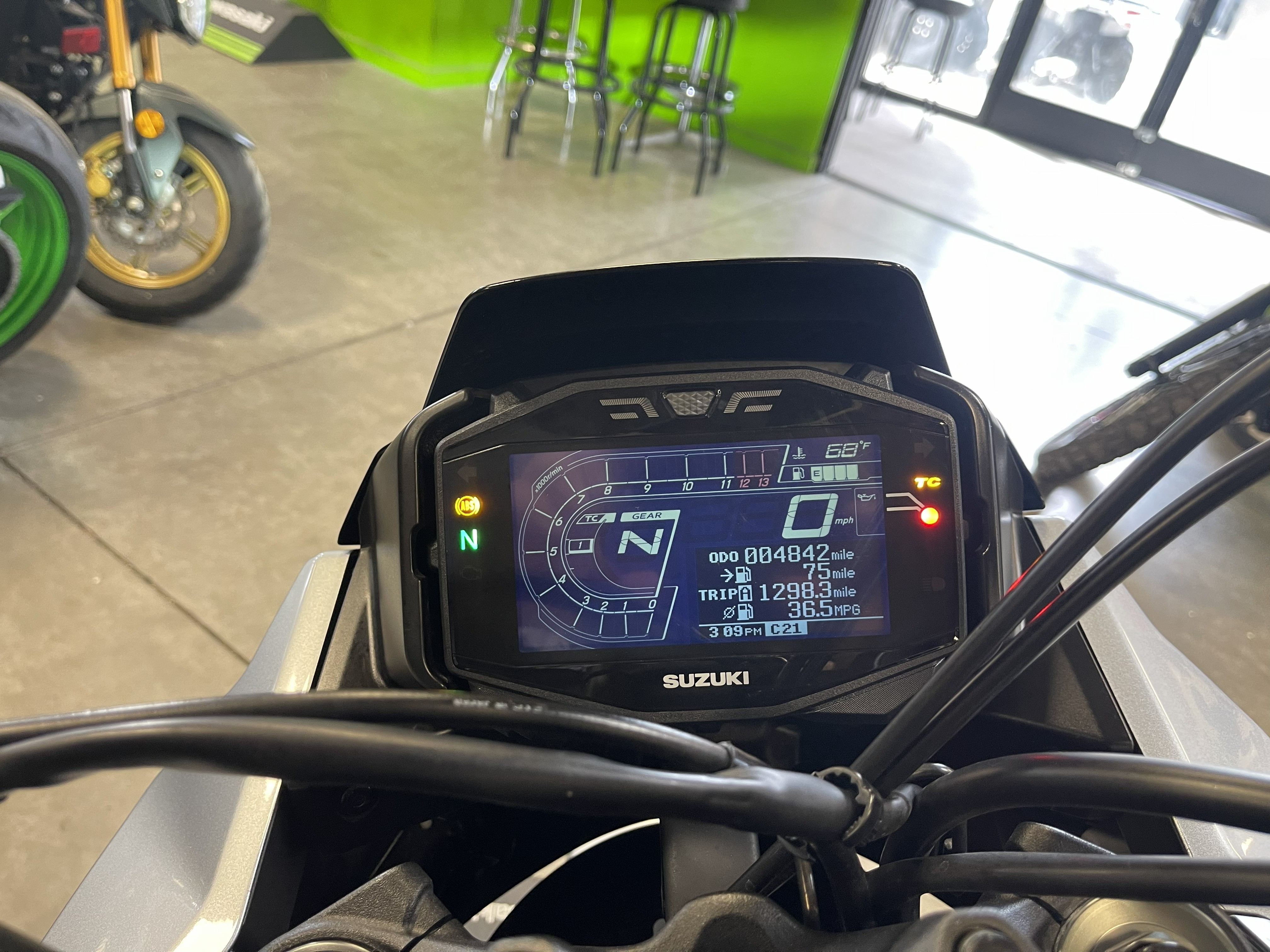 - The panel includes a digital speedometer, bar-style tachometer, odometer, dual trip meters, gear position, coolant temperatures, driving range, average fuel consumption, instantaneous fuel consumption, riding range, traction control level, plus lap-timer and clock functions.
