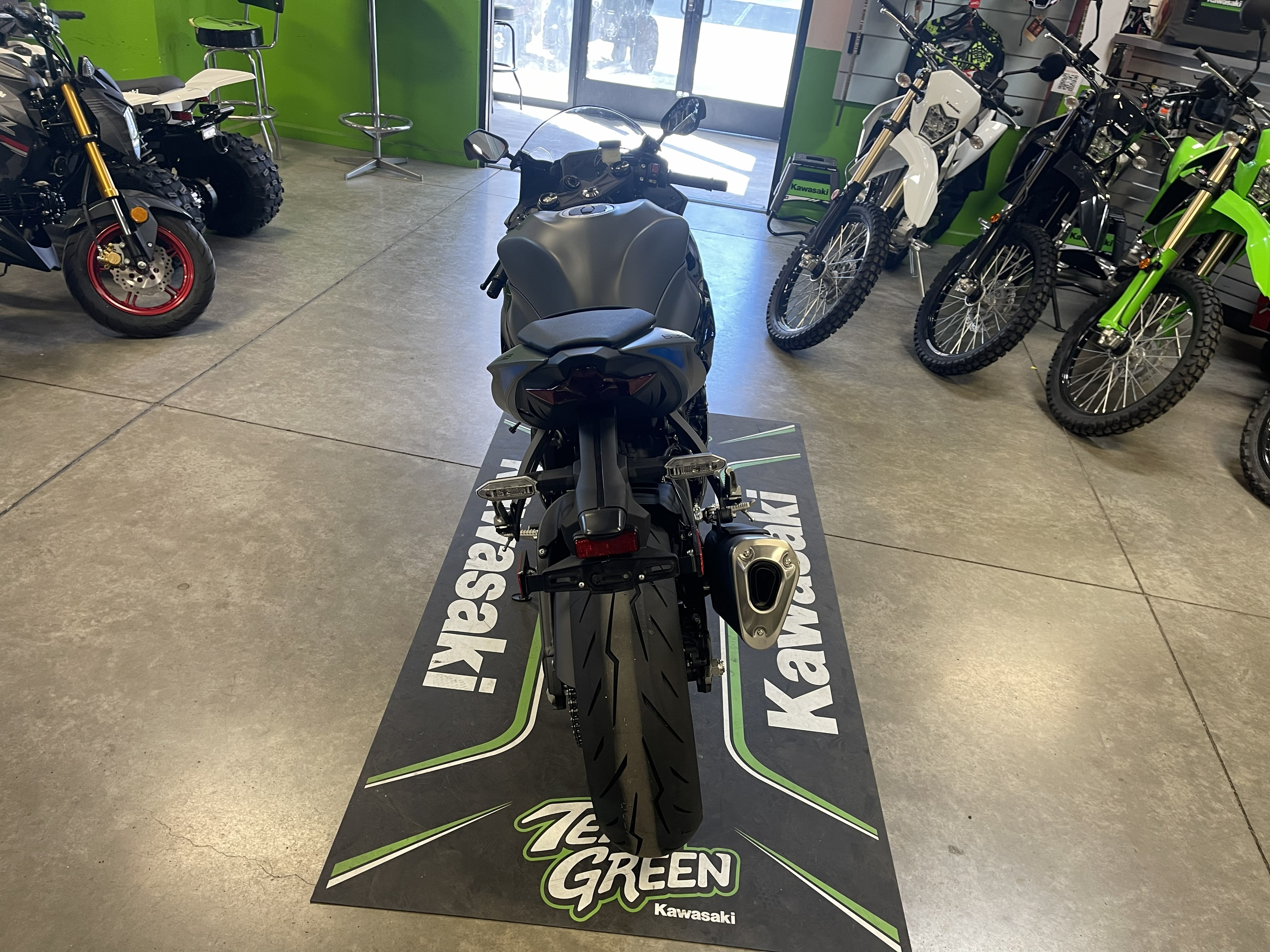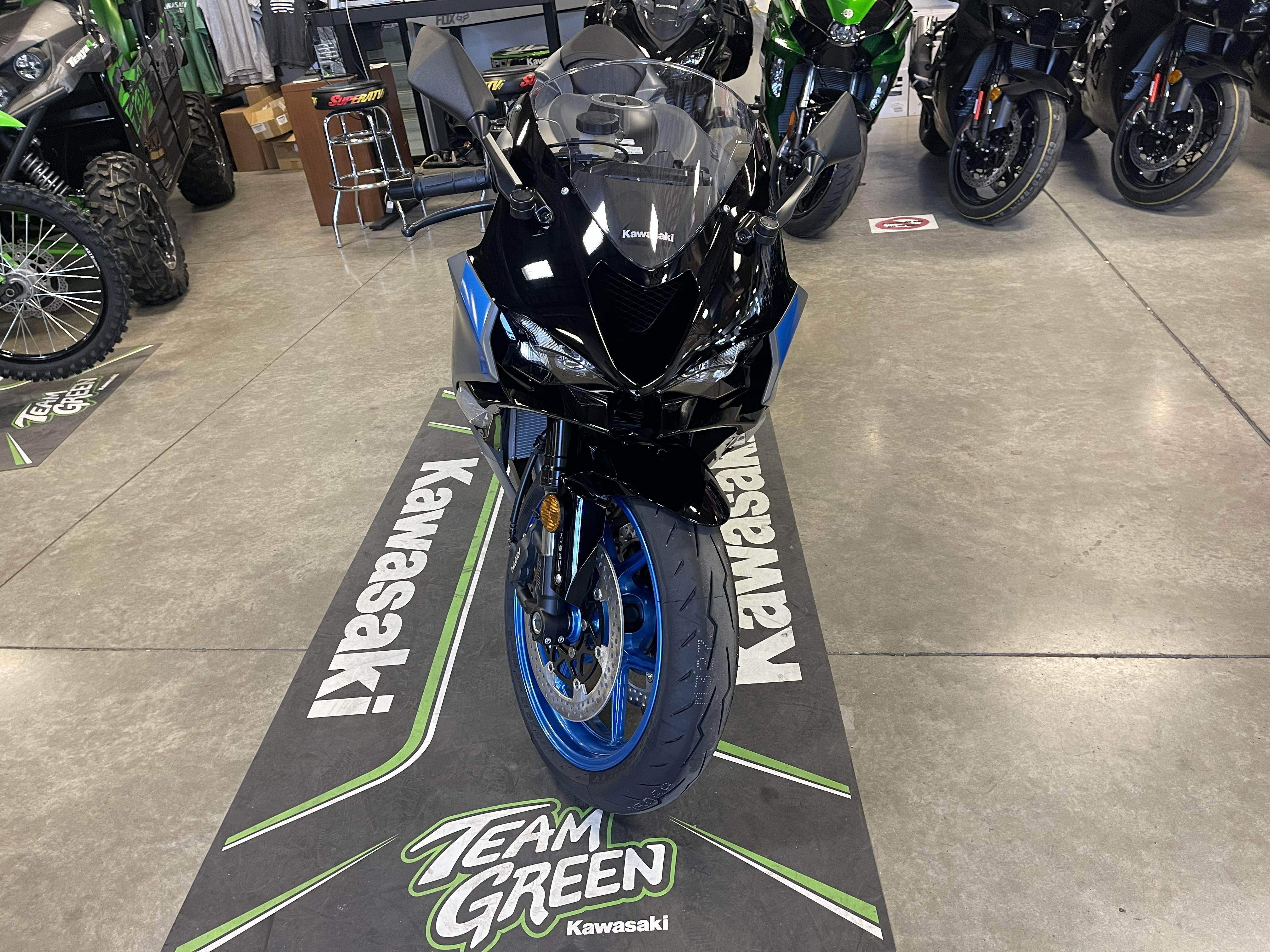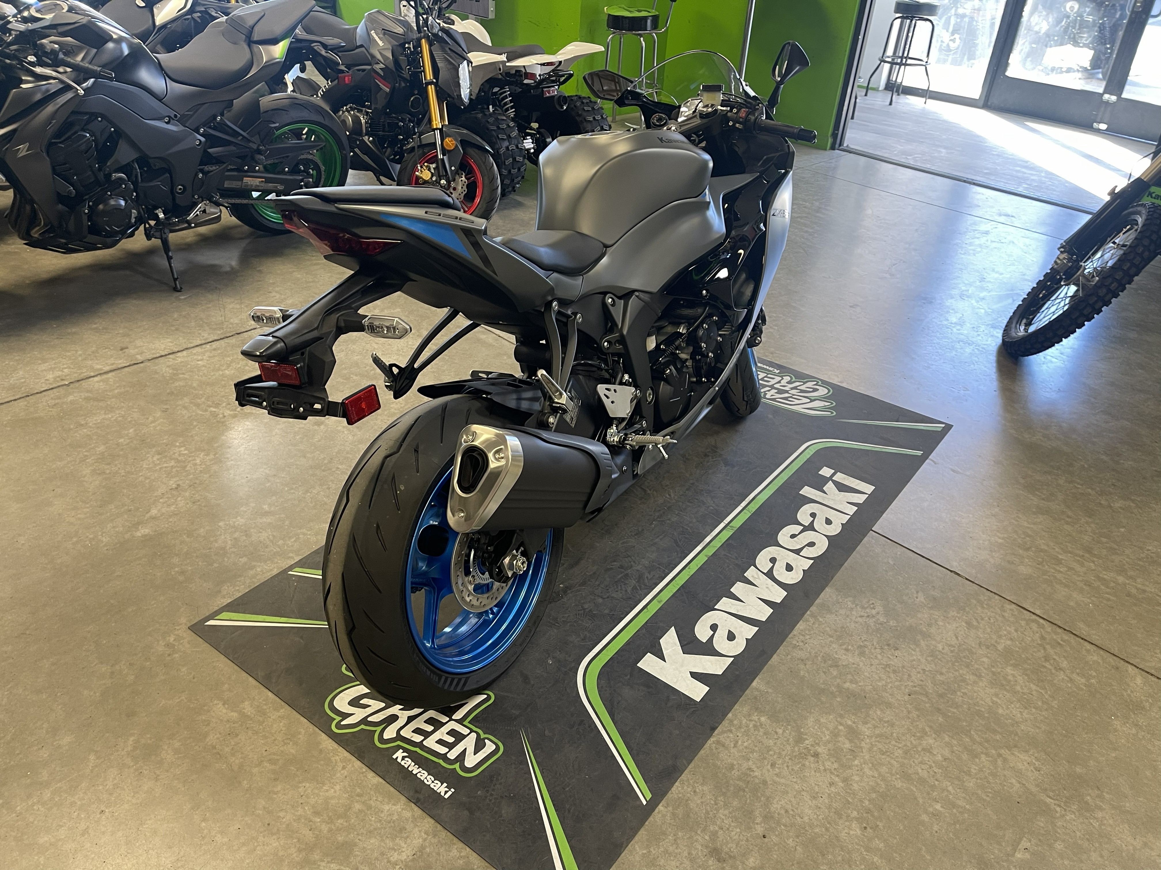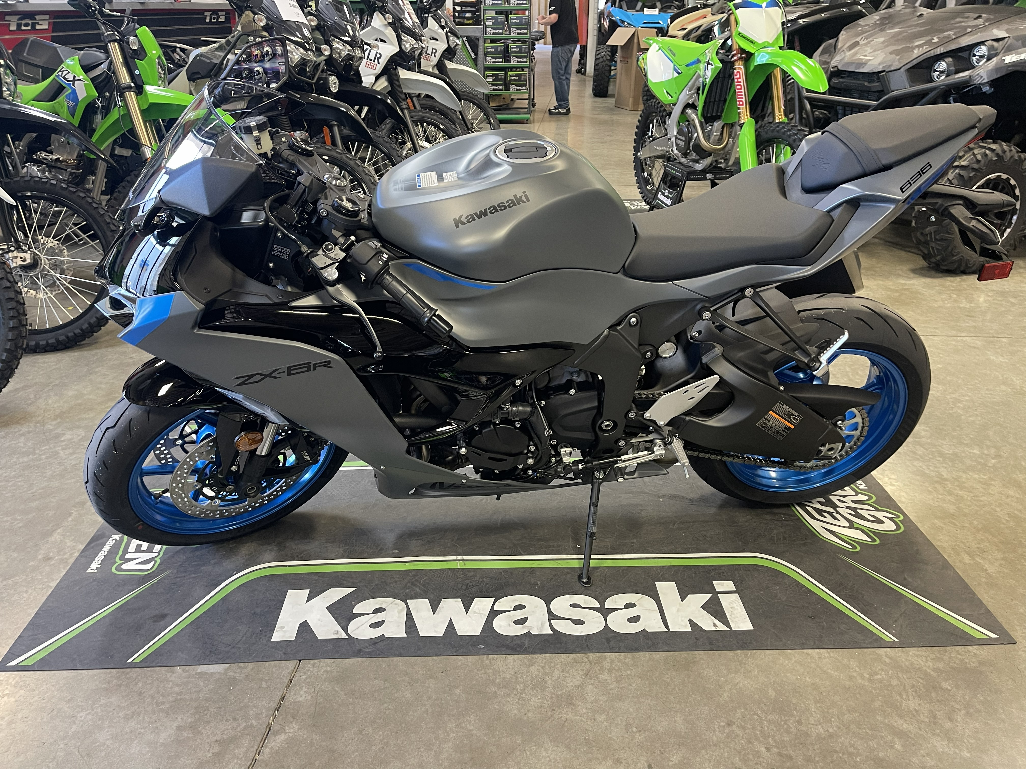 Beautiful 2026 ZX6R with the Matte Gray paint with the Gloss Black and Electric Blue wheels/highlights! Super Sport Super Star, doing the work in WSBK and local streets and tracks alike!